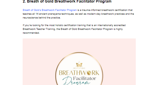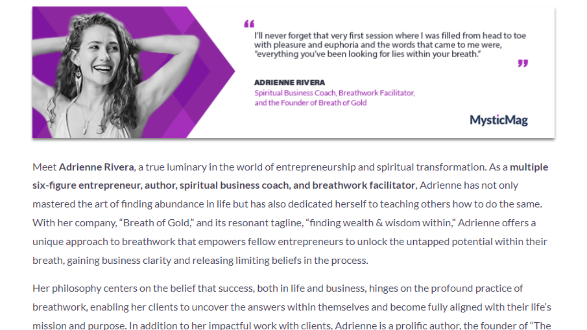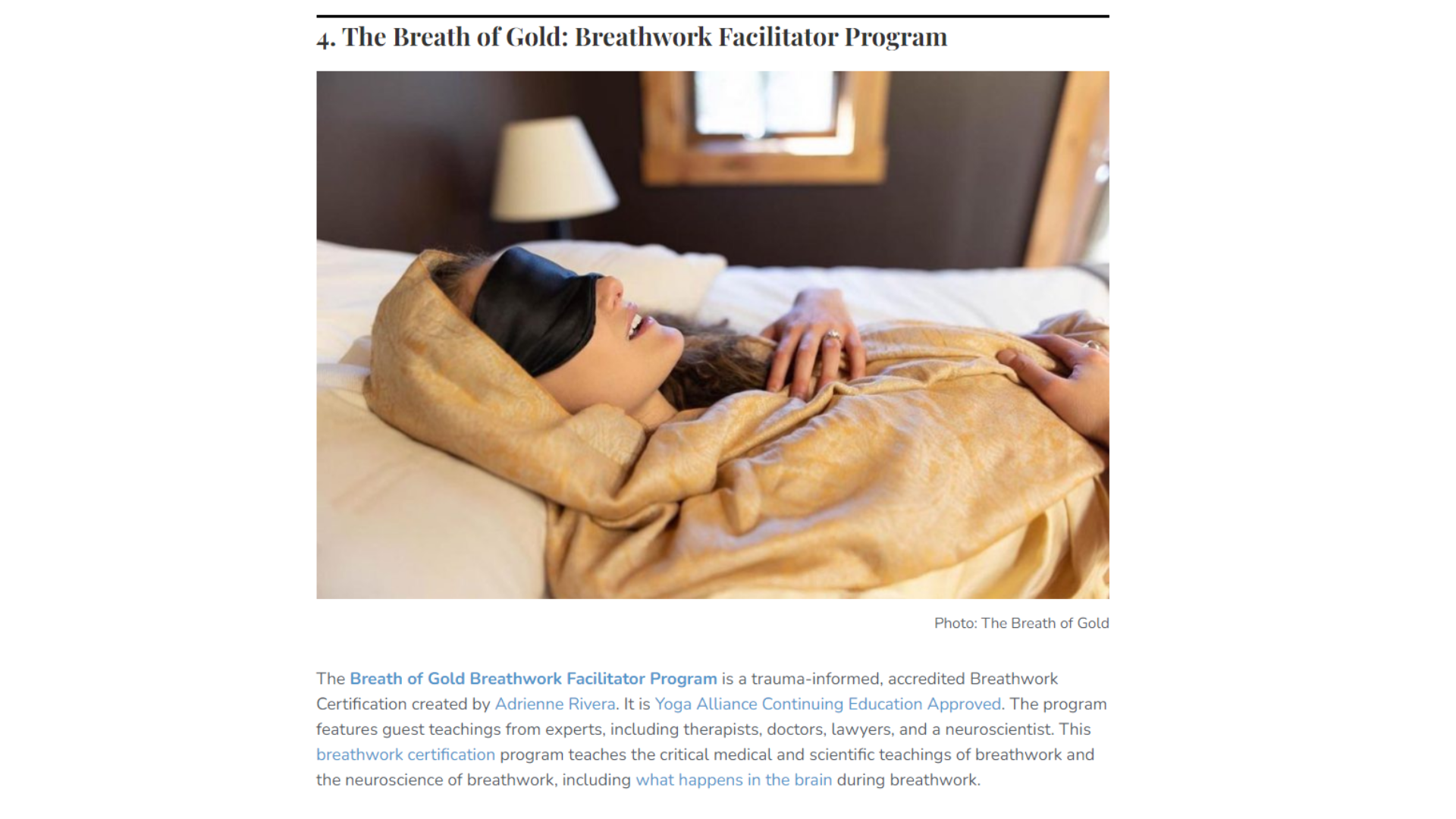 Adrienne Rivera, the founder of Breath of Gold®--which is most well-known for its trauma-informed Breathwork Facilitator Program. She has curated one of the top trauma-informed breathwork certification training programs in the world that features guest lectures from a doctor, neuroscience expert, lawyer, therapist, paramedic and more.